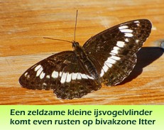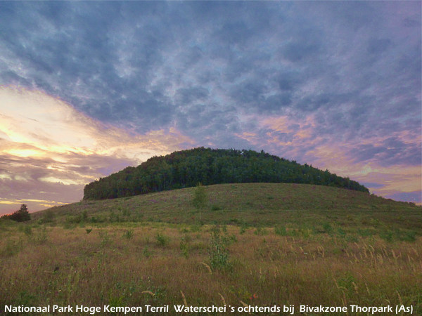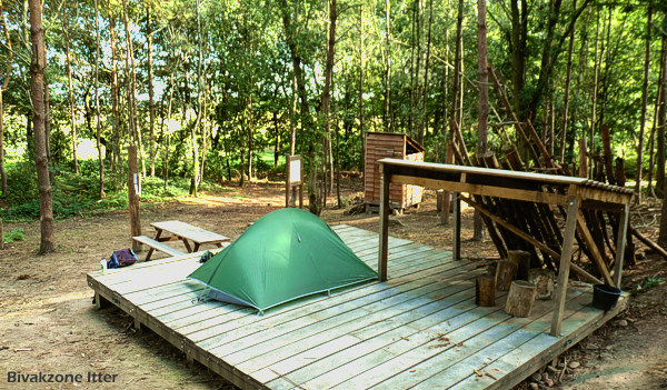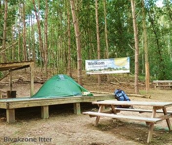 De meest noordelijke bivakzone, Itter, ligt dus op de Limburgse steilrand. Het terrein is er hellend, handig dan ook dat er een ruim tentenplatform is waarop je je tent waterpas kunt plaatsen. Je bivakkeert hier in een schaduwrijke omgeving van berken en eiken maar het zijn toch vooral de grove dennen die overheersen rond de bivakzone. Aan een zijde heb je tussen de bomen een vergezicht over akkers en