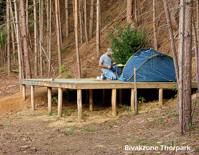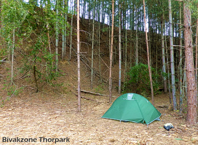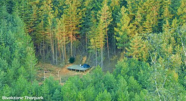 Bivakzone Thorpark ligt op een open plek omgeven door een jong dicht dennenbos. Online reservatie vooraf is gratis maar verplicht. Er kunnen maximaal 10 personen (3 tenten) tegelijk overnachten. Raadpleeg eerst even ter plaatse het bivakreglement voor je je tent prikt. Plaatselijke richtlijnen hebben prioriteit. Plaats je tent binnen deze ruime zone of op het tentplatform waarop tussen de planken aanhechtingspunten zijn voorzien.