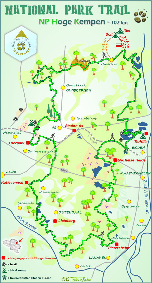 Het National Park Trail is bewegwijzerd in beide richtingen en loopt voor zowat 90 % over onverharde paden! Je kunt de tocht indelen in 5 etappes van pakweg 20 à 25 km per dag. Behalve Bivakzone Terhills ligt ook Bivakzone Thorpark kort (1 km) bij de langeafstandswandeling.