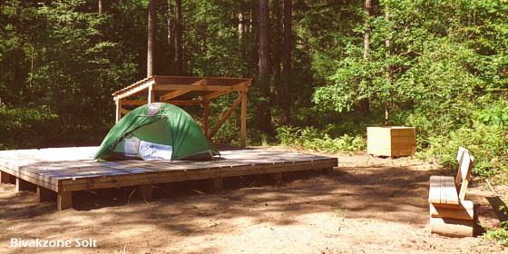 Wat je nog aantreft op bivakzones Solt en Itter zijn een kleine shelter op het tentplatform, een rust- en picknickbank, een fietsrek en een infobord met locatiekaart en bivakregels.